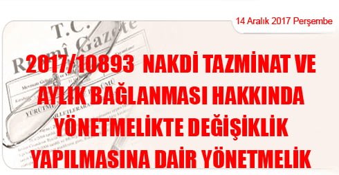 2017/10893 Nakdi Tazminat ve Aylık Bağlanması Hakkında Yönetmelikte Değişiklik Yapılmasına Dair Yönetmelik