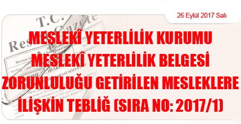 Meslekî Yeterlilik Kurumu Meslekî Yeterlilik Belgesi Zorunluluğu Getirilen Mesleklere İlişkin Tebliğ (Sıra No: 2017/1)