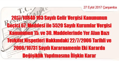 2017/10840 193 Sayılı Gelir Vergisi Kanununun Geçici 67 nci Maddesi ile 5520 Sayılı Kurumlar Vergisi Kanununun 15 inci ve 30 uncu Maddelerinde Yer Alan Bazı Tevkifat Nispetleri Hakkındaki 22/7/2006 Tarihli ve 2006/10731 Sayılı Kararnamenin Eki…