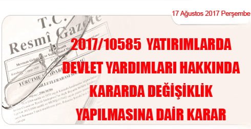 2017/10585 Yatırımlarda Devlet Yardımları Hakkında Kararda Değişiklik Yapılmasına Dair Karar