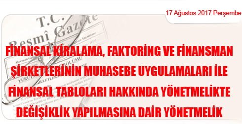 Finansal Kiralama, Faktoring ve Finansman Şirketlerinin Muhasebe Uygulamaları ile Finansal Tabloları Hakkında Yönetmelikte Değişiklik Yapılmasına Dair Yönetmelik