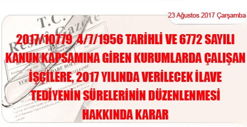 2017/10779 4/7/1956 Tarihli ve 6772 Sayılı Kanun Kapsamına Giren Kurumlarda Çalışan İşçilere, 2017 Yılında Verilecek İlave Tediyenin Sürelerinin Düzenlenmesi Hakkında Karar