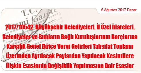 2017/10542 Büyükşehir Belediyeleri, İl Özel İdareleri, Belediyeler ve Bunların Bağlı Kuruluşlarının Borçlarına Karşılık Genel Bütçe Vergi Gelirleri Tahsilat Toplamı Üzerinden Ayrılacak Paylardan Yapılacak Kesintilere İlişkin Esaslarda