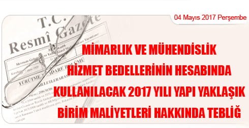 Mimarlık ve Mühendislik Hizmet Bedellerinin Hesabında Kullanılacak 2017 Yılı Yapı Yaklaşık Birim Maliyetleri Hakkında Tebliğ