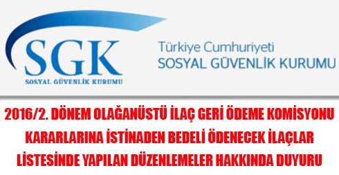 2016/2. Dönem Olağanüstü İlaç Geri Ödeme Komisyonu Kararlarına İstinaden Bedeli Ödenecek İlaçlar Listesinde Yapılan Düzenlemeler Hakkında Duyuru