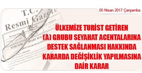 Ülkemize Turist Getiren (A) Grubu Seyahat Acentalarına Destek Sağlanması Hakkında Kararda Değişiklik Yapılmasına Dair Karar