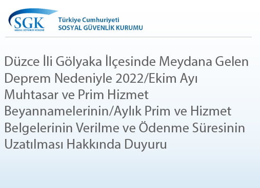 Düzce İli Gölyaka İlçesinde Meydana Gelen Deprem Nedeniyle 2022/Ekim Ayı Muhtasar ve Prim Hizmet Beyannamelerinin/Aylık Prim ve Hizmet Belgelerinin Verilme ve Ödenme Süresinin Uzatılması Hakkında Duyuru