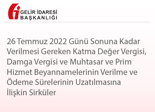 26 Temmuz 2022 Günü Sonuna Kadar Verilmesi Gereken Katma Değer Vergisi, Damga Vergisi ve Muhtasar ve Prim Hizmet Beyannamelerinin Verilme ve Ödeme Sürelerinin Uzatılmasına İlişkin Sirküler