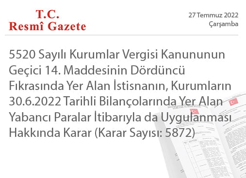 5520 Sayılı Kurumlar Vergisi Kanununun Geçici 14. Maddesinin Dördüncü Fıkrasında Yer Alan İstisnanın, Kurumların 30/6/2022 Tarihli Bilançolarında Yer Alan Yabancı Paralar İtibarıyla da Uygulanması Hakkında Karar (Karar Sayısı: 5872)