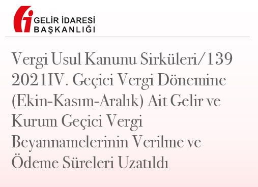 Vergi Usul Kanunu Sirküleri/139 2021IV. Geçici Vergi Dönemine (Ekin-Kasım-Aralık) Ait Gelir ve Kurum Geçici Vergi Beyannamelerinin Verilme ve Ödeme Süreleri Uzatıldı