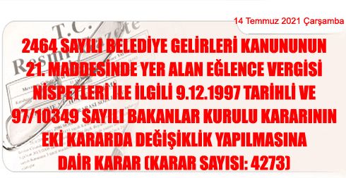 2464 Sayılı Belediye Gelirleri Kanununun 21. Maddesinde Yer Alan Eğlence Vergisi Nispetleri ile İlgili 9.12.1997 Tarihli ve 97/10349 Sayılı Bakanlar Kurulu Kararının Eki Kararda Değişiklik Yapılmasına Dair Karar (Karar Sayısı: 4273)
