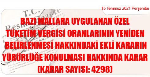Bazı Mallara Uygulanan Özel Tüketim Vergisi Oranlarının Yeniden Belirlenmesi Hakkındaki Ekli Kararın Yürürlüğe Konulması Hakkında Karar (Karar Sayısı: 4298)