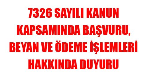 7326 Sayılı Kanun Kapsamında Başvuru, Beyan ve Ödeme İşlemleri Hakkında Duyuru