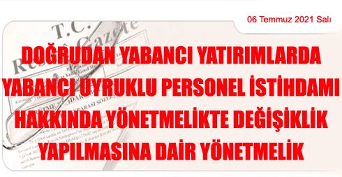 Doğrudan Yabancı Yatırımlarda Yabancı Uyruklu Personel İstihdamı Hakkında Yönetmelikte Değişiklik Yapılmasına Dair Yönetmelik