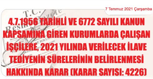 4/7/1956 Tarihli ve 6772 Sayılı Kanun Kapsamına Giren Kurumlarda Çalışan İşçilere, 2021 Yılında Verilecek İlave Tediyenin Sürelerinin Belirlenmesi Hakkında Karar (Karar Sayısı: 4226)