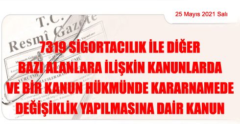 7319 Sigortacılık ile Diğer Bazı Alanlara İlişkin Kanunlarda ve Bir Kanun Hükmünde Kararnamede Değişiklik Yapılmasına Dair Kanun