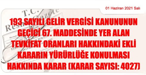193 Sayılı Gelir Vergisi Kanununun Geçici 67 nci Maddesinde Yer Alan Tevkifat Oranları Hakkındaki Ekli Kararın Yürürlüğe Konulması Hakkında Karar (Karar Sayısı: 4027)
