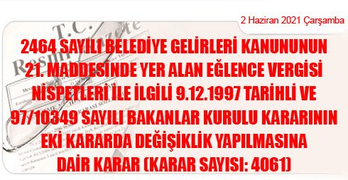 2464 Sayılı Belediye Gelirleri Kanununun 21 inci Maddesinde Yer Alan Eğlence Vergisi Nispetleri ile İlgili 9/12/1997 Tarihli ve 97/10349 Sayılı Bakanlar Kurulu Kararının Eki Kararda Değişiklik Yapılmasına Dair Karar (Karar Sayısı: 4061)