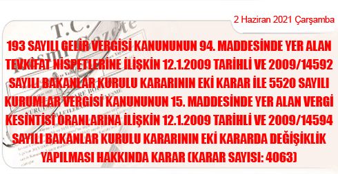 193 Sayılı GVK’nun 94. Maddesinde Yer Alan Tevkifat Nispetlerine İlişkin 12.1.2009 Tarihli ve 2009/14592 Sayılı BKK’nın Eki Karar ile 5520 Sayılı KVK’nun 15. Maddesinde … (Karar Sayısı: 4063)