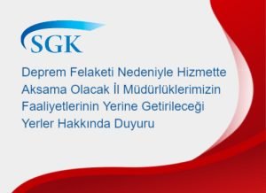 T.C. SOSYAL GÜVENLİK KURUMU BAŞKANLIĞI DUYURU (28 Şubat 2023 tarihinde SGK tarafından yayınlanmıştır) DEPREM FELAKETİ NEDENİYLE HİZMETTE AKSAMA OLACAK İL MÜDÜRLÜKLERİMİZİN FAALİYETLERİNİN YERİNE GETİRİLECEĞİ YERLER