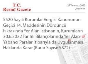 CUMHURBAŞKANI KARARI (27 Temmuz 2022 tarihli ve 31905 sayılı Resmi Gazete’ de yayımlanmıştır) Karar Sayısı: 5872 5520 sayılı Kurumlar Vergisi Kanununun geçici 14. maddesinin dördüncü