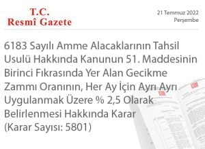 CUMHURBAŞKANI KARARI (21 Temmuz 2022 tarihli ve 31899 sayılı Resmi Gazete’ de yayımlanmıştır) Karar Sayısı: 5801 6183 sayılı Amme Alacaklarının Tahsil Usulü Hakkında Kanunun 51.