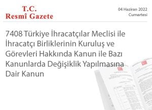 TÜRKİYE İHRACATÇILAR MECLİSİ İLE İHRACATÇI BİRLİKLERİNİN KURULUŞ VE GÖREVLERİ HAKKINDA KANUN İLE BAZI KANUNLARDA DEĞİŞİKLİK YAPILMASINA DAİR KANUN Kanun No. 7408 Kabul Tarihi: 2.6.2022 (04