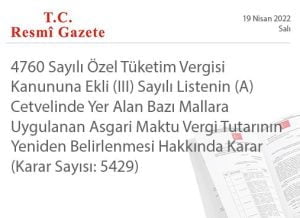 4760 Sayılı Özel Tüketim Vergisi Kanununa Ekli (III) Sayılı Listenin (A) Cetvelinde Yer Alan Bazı Mallara Uygulanan Asgari Maktu Vergi Tutarının Yeniden Belirlenmesi Hakkında Karar (Karar Sayısı: 5429)