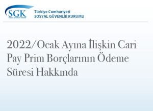 SOSYAL GÜVENLİK KURUMU BAŞKANLIĞI DUYURU (24 Şubat 2022 tarihinde SGK tarafından yayınlanmıştır) 2022/Ocak Ayına İlişkin Cari Ay Prim Borçlarının Ödeme Süresi Hakkında Duyuru 2022/Ocak ayına