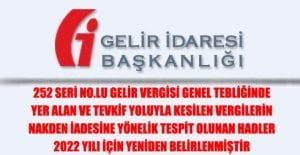 252 SERİ NO.LU GELİR VERGİSİ GENEL TEBLİĞİNDE YER ALAN VE TEVKİF YOLUYLA KESİLEN VERGİLERİN NAKDEN İADESİNE YÖNELİK TESPİT OLUNAN HADLER 2022 YILI İÇİN YENİDEN BELİRLENMİŞTİR