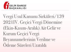 T.C. HAZİNE VE MALİYE BAKANLIĞI Gelir İdaresi Başkanlığı VERGİ USUL KANUNU SİRKÜLERİ / 139 Konusu: 17 Şubat 2022 günü sonuna kadar verilmesi gereken 2021 IV.