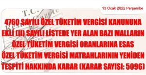CUMHURBAŞKANI KARARI (13 Ocak 2022 tarihli ve 31718 sayılı Resmi Gazete’ de yayımlanmıştır) Karar Sayısı: 5096 4760 sayılı Özel Tüketim Vergisi Kanununa ekli (II) sayılı