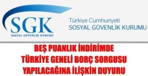 BEŞ PUANLIK İNDİRİMDE TÜRKİYE GENELİ BORÇ SORGUSU YAPILACAĞINA İLİŞKİN DUYURU (31 Aralık 2021 tarihinde SGK tarafından yayımlanmıştır) 5510 sayılı Kanunun 81. maddesinin birinci fıkrasının (ı) bendinde yer alan beş puanlık
