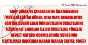CUMHURBAŞKANI KARARI (05 Ocak 2022 tarihli ve 31710 sayılı Resmi Gazete’ de yayımlanmıştır) Karar Sayısı: 5063 Aday çırak ve çıraklar ile işletmelerde mesleki eğitim