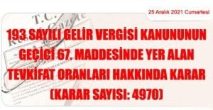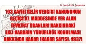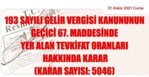 CUMHURBAŞKANI KARARI (31 Aralık 2021 tarihli ve 31706 sayılı Resmi Gazete’ de yayımlanmıştır) Karar Sayısı: 5046 193 sayılı Gelir Vergisi Kanununun geçici 67.