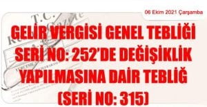 Hazine ve Maliye Bakanlığı (Gelir İdaresi Başkanlığı)’ndan: GELİR VERGİSİ GENEL TEBLİĞİ SERİ NO: 252’DE DEĞİŞİKLİK YAPILMASINA DAİR TEBLİĞ (SERİ NO: 315) (06 Ekim 2021