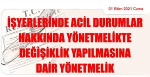 Çalışma ve Sosyal Güvenlik Bakanlığından: İŞYERLERİNDE ACİL DURUMLAR HAKKINDA YÖNETMELİKTE DEĞİŞİKLİK YAPILMASINA DAİR YÖNETMELİK (01 Ekim 2021 tarihli ve 31615 sayılı Resmi Gazete’ de
