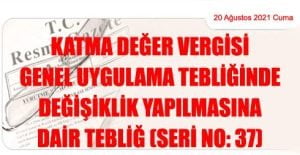Hazine ve Maliye Bakanlığı (Gelir İdaresi Başkanlığı)’ndan: KATMA DEĞER VERGİSİ GENEL UYGULAMA TEBLİĞİNDE DEĞİŞİKLİK YAPILMASINA DAİR TEBLİĞ (SERİ NO: 37) (20 Ağustos 2021 Tarihli