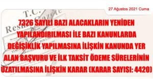 CUMHURBAŞKANI KARARI (27 Ağustos 2021 Tarihli ve 31581 Sayılı Resmi Gazete’ de Yayımlanmıştır) Karar Sayısı: 4420 7326 sayılı Bazı Alacakların Yeniden Yapılandırılması ile