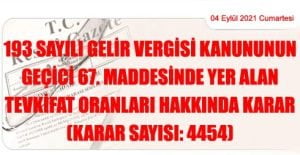 CUMHURBAŞKANI KARARI (04 Eylül 2021 tarihli ve 31588 sayılı Resmi Gazete’ de yayımlanmıştır) Karar Sayısı: 4454 193 sayılı Gelir Vergisi Kanununun geçici 67.