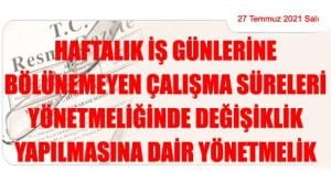 Çalışma ve Sosyal Güvenlik Bakanlığından: HAFTALIK İŞ GÜNLERİNE BÖLÜNEMEYEN ÇALIŞMA SÜRELERİ YÖNETMELİĞİNDE DEĞİŞİKLİK YAPILMASINA DAİR YÖNETMELİK (27 Temmuz 2021 Tarihli ve 31550 Sayılı Resmi