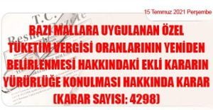 CUMHURBAŞKANI KARARI (15 Temmuz 2021 Tarihli ve 31542 Sayılı Resmi Gazete’ de Yayımlanmıştır) Karar Sayısı: 4298 Bazı mallara uygulanan özel tüketim vergisi oranlarının