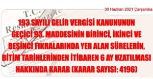 CUMHURBAŞKANI KARARI (30 Haziran 2021 Tarihli ve 31527 Sayılı Resmi Gazete’ de Yayımlanmıştır) Karar Sayısı: 4196 193 sayılı Gelir Vergisi Kanununun geçici 93.