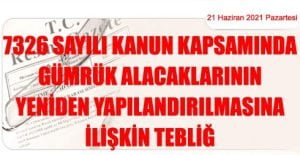 Ticaret Bakanlığından: 7326 SAYILI KANUN KAPSAMINDA GÜMRÜK ALACAKLARININ YENİDEN YAPILANDIRILMASINA İLİŞKİN TEBLİĞ (21 Haziran 2021 Tarihli ve 31518 Sayılı Resmi Gazete’ de Yayımlanmıştır)