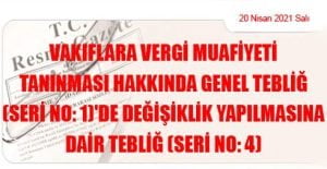 Hazine ve Maliye Bakanlığından: VAKIFLARA VERGİ MUAFİYETİ TANINMASI HAKKINDA GENEL TEBLİĞ (SERİ NO: 1)’DE DEĞİŞİKLİK YAPILMASINA DAİR TEBLİĞ (SERİ NO: 4) (20 Nisan 2021