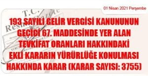 CUMHURBAŞKANI KARARI (01 Nisan 2021 Tarihli ve 31441 Sayılı Resmi Gazete’ de Yayımlanmıştır) Karar Sayısı: 3755 193 sayılı Gelir Vergisi Kanununun geçici 67.