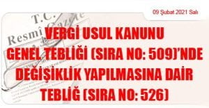 Hazine ve Maliye Bakanlığı (Gelir İdaresi Başkanlığı)’ndan: VERGİ USUL KANUNU GENEL TEBLİĞİ (SIRA NO: 509)’NDE DEĞİŞİKLİK YAPILMASINA DAİR TEBLİĞ (SIRA NO: 526) (09 Şubat