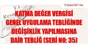 Hazine ve Maliye Bakanlığı (Gelir İdaresi Başkanlığı)’ndan: KATMA DEĞER VERGİSİ GENEL UYGULAMA TEBLİĞİNDE DEĞİŞİKLİK YAPILMASINA DAİR TEBLİĞ (SERİ NO: 35) (16 Şubat 2021 Tarihli
