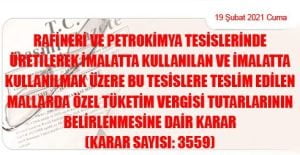 CUMHURBAŞKANI KARARI (19 Şubat 2021 Tarihli ve 31400 Sayılı Resmi Gazete’ de Yayımlanmıştır) Karar Sayısı: 3559 Ekli “Rafineri ve Petrokimya Tesislerinde Üretilerek İmalatta Kullanılan