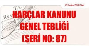 Hazine ve Maliye Bakanlığı (Gelir İdaresi Başkanlığı)’ndan: HARÇLAR KANUNU GENEL TEBLİĞİ (SERİ NO: 87) (29 Aralık 2020 Tarihli ve 31349 – 1.Mükerrer Sayılı Resmi